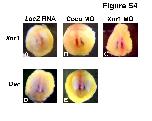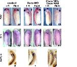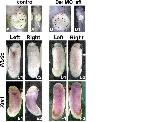 Supplementary Fig. S4. Coco and Xnr1 MOs do not affect expression of posterior paraxial genes. Double in situ hybridization for the indicated markers (purple) and LacZ (red). Coco MO (3 ng, right dorsal side) and Xnr1 MO (2 ng, left dorsal side) were coinjected with LacZ RNA (1 ng) in the C2 blastomere (32 cell stage), and embryos were collected at stage 18. Inner side of dissected posterior poles is shown, dorsal side up. A-C Xnr1 in situ. D, E derrie in situ. A, D LacZ RNA injections. B, E Coco MO+LacZ RNA. C Xnr1 MO+LacZ RNA.. |