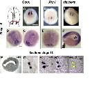 Coco, Xnr1 and derrie are coexpressed in previous termXenopusnext term neurula. In situ hybridization for Coco (A, F, G, H1), Xnr1 (D, E, H2), and derrie (I, J). Panels A, D, I are inner views of posterior fragments, dorsal side up, dissected as shown in the drawing on upper left (dorsal view, anterior is up); B, C, E are cleared whole embryos, dorsal views, posterior side down; J is a cleared embryo, lateral view, anterior to the left; F is a paraxial longitudinal section of a whole-mount in situ stained embryo, G2 are in situ hybridizations of horizontal paraffin sections. Panels H1 and H2 are consecutive sections (15 μm thick), and H3 is an overlap of H1 and 2, with false color for Coco (green) and Xnr1 (red), and the overlap (yellow). Horizontal lines in H1 and H2 indicate the lateral borders of the notochord. The lower arrowhead in panel J shows the most posterior segment of derrie expression. Scale bars panels in A and B represent 0.2 mm. |