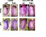 Coco RNA prevents expression of left side markers. Embryos were injected on the left dorsal side of four-cell stage embryos with Coco RNA (10 pg) and collected at stage 24. In situ hybridization for Pitx2c (A, B) and Xnr1 (C, D). Left and right sides of the same embryos are shown. Arrowheads in panels C and D indicate the posterior, bilateral expression domain of Xnr1, not affected by Coco RNA. |