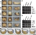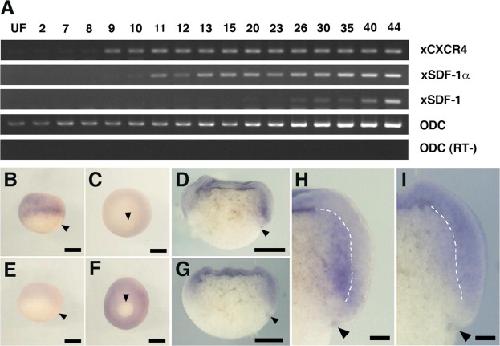 Expression pattern of xCXCR4, and xSDF-1α and xSDF-1. (A) RT-PCR analysis of xCXCR4, and xSDF-1α and xSDF-1. xCXCR4 transcripts increased at the late blastula stage (St. 9). xSDF-1α was detected at the early gastrula stage (St.10), however xSDF-1 transcript levels increased at the tailbud stage (St.26). ODC was included as a loading control. (BâI) Spatial expression pattern of xCXCR4 (BâD,H) and xSDF-1α (EâG,I). Each panel demonstrates the lateral view of stage 10 (B,E), vegetal view of stage 11.5 (C,F), sagittal section of stage 10 (D,GâI), embryos. The panels of (H and I) indicate power magnified views of the dorsal side of (D and G), respectively. Arrowheads indicate the dorsal blastopore. White-dotted lines in (H and I) indicate the border of IMZ and BCR. Scale bar in (BâG), 0.5 mm, and 0.1 mm in (H and I).