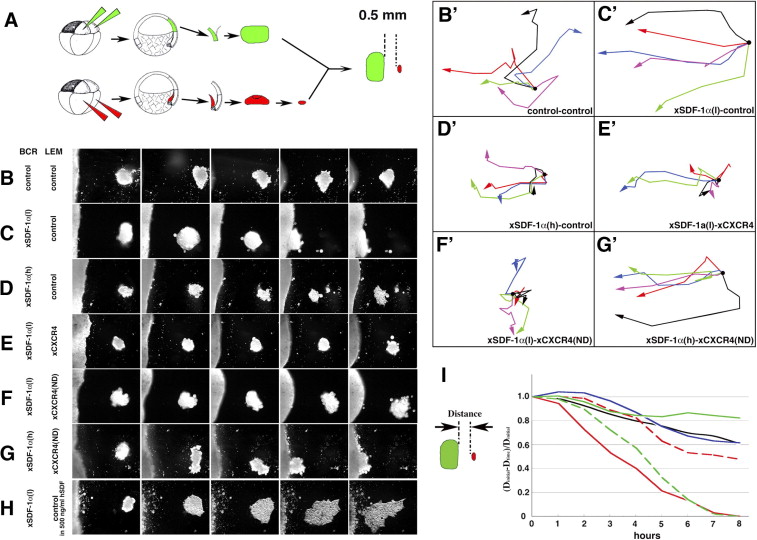Migration of the LEM explants towards the BCR explants. (A) Experimental procedure. See Materials and methods. (B–H) Frames of time-lapse movies. The BCR explants are shown on the left, and the LEM explants on the right. The letters “l” and “h” indicate low-level over-expression and high-level over-expression, respectively. Control (BCR) and control (LEM) (B), xSDF-1α(l) and control (C), xSDF-1α(h) and control (D), xSDF-1α(l) and xCXCR4 (E), xSDF-1α(l) and xCXCR4(ND) (F), xSDF-1α(h) and xCXCR4(ND) (G), xSDF-1α(l) and control in 500 ng/ml hSDF (H). The time elapsed is indicated at the top right corner. Scale bar, 200 μm. See Supplemental movies of B–H. (B′–G′) Lines indicate the traces of the LEM movements over eight hours in panels of (B–G), respectively. The dot shows the initial position of the LEM. (I) The ratio of migration (N = 5). The ratio of the distance between the BCR explants and the LEM explants was measured every hour, and is shown by black for (B), red for (C), red-dotted for (D), blue for (E), green for (F), and green-dotted for (G) lines.