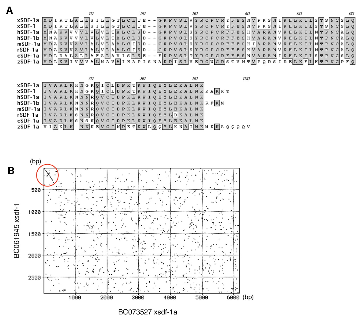 (zSDF-1α; AY147915) SDF-1. Shadow boxes represent shared amino acids. (B) Matrix plot of