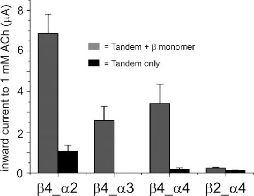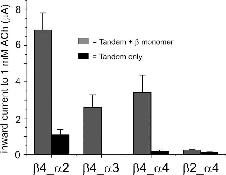 Figure 3. . Some tandem constructs form functional channels when expressed alone in Xenopus oocytes. Tandem constructs were expressed with or without monomer construct of the same β subunit they contain (β2 or β4; 2 ng/μl tandem to 0.5 ng/μl monomer; 46 nl injected/oocyte). The four tandem constructs shown here were the only ones to produce functional receptors when expressed with the corresponding β monomer (n = 5–10). Note that three out of these four tandem constructs produced inward currents to 1 mM ACh also when expressed alone (2 ng/μl injected, n = 4–6). Only the β4_α3 tandem construct failed to produce any inward currents (n = 6) when expressed alone.