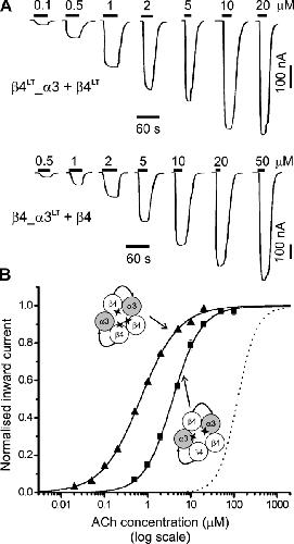 Figure 5. . The effects of inserting a L9′T reporter mutation into all the α or all the β subunits in tandem construct receptors. (A) Examples of inward currents elicited by bath-applied ACh in oocytes expressing β4LT_α3 + β4LT (top) or β4_α3LT + β4 (bottom). (B) Concentration-response curves from oocytes injected with β4LT_α3 + β4LT cRNAs (filled triangles, n = 7) or β4_α3LT + β4 cRNAs (filled squares, n = 8). For details of the fitting see materials and methods and the legend to Fig. 2. The concentration-response curve for the β4_α3 + β4 wild-type nAChR (from Fig. 2 B) is shown for reference (dotted line). The EC50 shifts produced by the mutation are similar to those observed in α3 + β4 receptors and suggest that the channel gate is made up of two α and three β subunits both in linked-subunit and in monomer construct receptors.