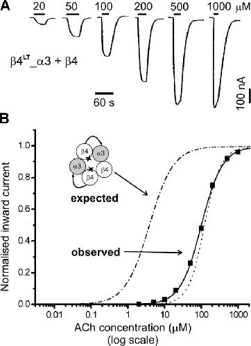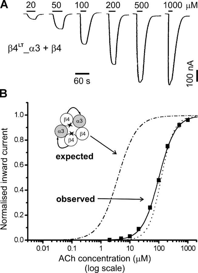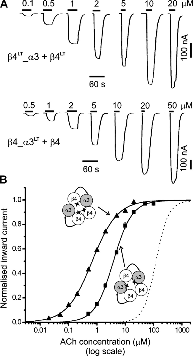 Figure 6. . Low ACh sensitivity of linked subunit receptors carrying the L9′T reporter mutation in β4tandem only. (A) Examples of inward currents elicited by bath-applied ACh in oocytes expressing β4LT_α3 + β4. (B) Data from oocytes injected with β4LT_α3 + β4 cRNAs (filled squares, n = 7). Fits as in Fig. 2. The concentration-response curve for β4_α3 + β4 wild-type (see Fig. 2 B) is shown for reference (dotted line), together with the concentration-response curve for the β4_α3LT + β4 combination (from Fig. 4 B, dashed line): the latter shows the EC50 shift expected with the incorporation of two L9′T mutations.