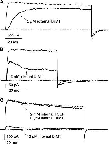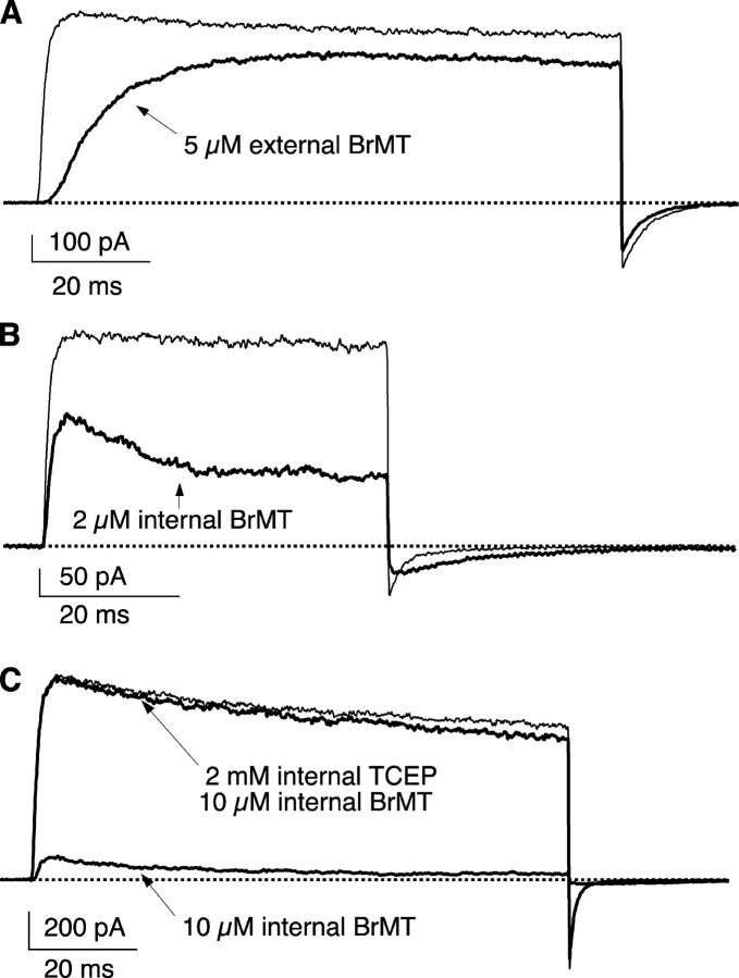 Figure 1. . Sidedness of BrMT effect on ShBΔ IK from excised oocyte patches. IK in A and B is from ShBΔ with C-type inactivation minimized by the T449Y mutation. The ShBΔ channels in C do not contain the mutation at position 449. (A) Effects of external BrMT on ShBΔ IK from an outside-out patch. BrMT greatly slows activation kinetics and leads to a reduction in peak amplitude. Voltage step to +20 mV from −100 mV. Thin trace: control condition. Thick trace: external solution with 5 μM BrMT. TCEP was not included in the internal solution. (B) BrMT applied to inside-out patches has no apparent effect on activation but reduces peak IK, induces a decline in amplitude after the peak, and slows deactivation kinetics. Step to +40 mV from −100 mV. Thin trace: control condition. Thick trace: internal solution with 2 μM BrMT. (C) The monomeric form of BrMT does not block ShBΔ channels from the internal side of an inside-out patch. Including the disulfide reducing agent TCEP (2 mM) with 10 μM BrMT eliminates effects of internal BrMT. Voltage step from −80 to +20 mV returning to −120 mV. Thin trace: control condition. Thick traces: internal solution includes either 10 μM BrMT and 2 mM TCEP or 10 μM BrMT but no TCEP.