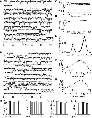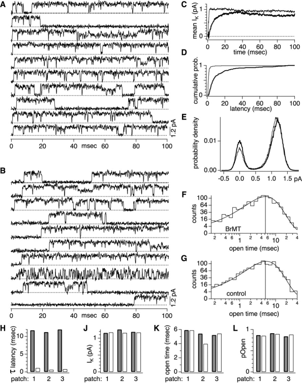 Figure 4. . Effects of 5 μM BrMT on single ShBΔ channels. Analyses was conducted on IK from outside-out patches containing one functional ShBΔ channel during 100-ms steps to +40 mV from −100 mV. Data in A–G are from a single patch (patch 3 in H–L). In C–G, analyses of control currents are represented by thin traces, and IK in 5 μM BrMT by thick traces. In H–L, thick-rimmed grayed bars are measurements in BrMT and hollow bars under control conditions. (A) Representative traces containing single channel openings under control conditions. (B) Openings of the same channel in 5 μM BrMT. (C) Ensemble averages of sweeps containing channel openings (i.e., nonblank sweeps). (D) Cumulative first latencies from sweeps containing openings. (E) Unitary conductance does not change in BrMT. All-points histograms were compiled from sweeps without apparent substates. Bin width is 10 fA. (F) Logarithmically binned open durations in BrMT. Substates were not included in this analysis. Curve is fit for a single open state. The mean open time of 5.2 ms indicated by a vertical line. (G) Open durations under control conditions. Mean open time is 5.4 ms. (H) Time constants of exponential fits to the final 50% rise of cumulative first latencies. (J) Unitary conductance is unchanged by BrMT. Unitary IK in 5 μM BrMT versus control was 1.01 ± 0.02 (n = 6) while peak macroscopic IK was reduced to 0.80 ± 0.02 (n = 10). (K) Mean open time is little affected by BrMT (L) Conditional probabilities that a channel is open provided it has opened previously. Calculated for sweeps containing channel openings (see results and materials and methods). The first and last idealized events were not included in determination of pOpen.