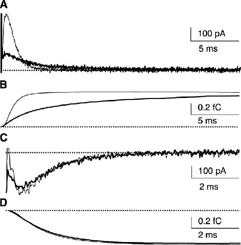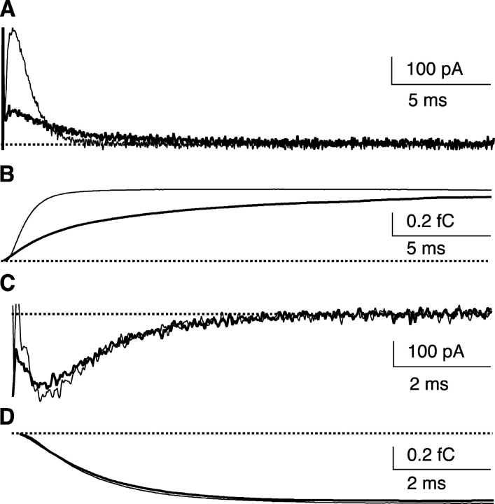 Figure 5. . Effects of BrMT on ShBΔ gating currents. Gating currents were recorded from CHO-K1 cells expressing ShBΔ channels. Similar effects on ShBΔ Ig were seen in nine cells. Thin traces: control condition. Thick traces: in 5 μM BrMT. The zero current baseline for gating charge integration (Q) was set individually for each trace, after the Ig transient decayed to steady-state. (A) IgON is slowed and peak amplitude is greatly reduced by BrMT. Voltage steps are to +20 mV from −100 mV. (B) Integrated charge movement (QON) from IgON in A. (C) IgOFF in BrMT is similar to control. Voltage steps are to −140 mV after a 200-ms activating pulse to +20 mV. (D) Integrated charge movement (QOFF) from IgOFF in C. QOFF in BrMT was 1.02 ± 0.02 that of control, n = 4 cells.