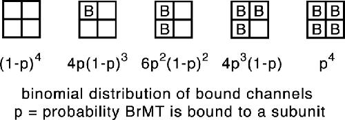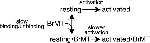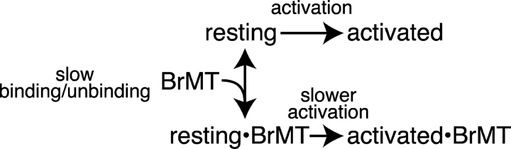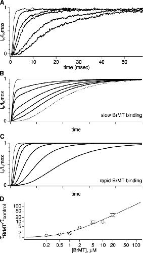 Figure 7. . Graded activation slowing can be modeled by rapid, reversible binding of BrMT to resting voltage sensors. (A) ShBΔ IK scaled to match peak current amplitudes. Thin trace: voltage step from −100 to +40 mV under control conditions. Thick traces: progressive slowing of activation at +40 mV by 1, 2, 5, 10, and 20 μM BrMT. (B) Predicted IK from an activation model with slow BrMT binding to each of four subunits that undergo a single activating transition. Subunits bound to BrMT activate 20-fold slower than those without. This value was chosen because the maximal slowing of ShBΔ activation seen was ∼20-fold in BrMT versus control (see D). The proportion of channels with 0, 1, 2, 3, or 4 BrMT bound was binomial. Thin line: control condition. Dotted line: saturating BrMT. Thick lines: [BrMT] = 0.2, 0.5, 1, 2, and 5× KD. (C) Predicted IK from Eq. 4. This equation represents an n4 model of activation with rapid BrMT binding as in Scheme IV. Increasing the concentration of BrMT slows activation by increasing the proportion of time subunits are bound to BrMT and thus unable to activate. Thin line: control condition. Thick lines: [BrMT] = 1, 2, 5, 10, and 20× KD. (D) Filled circles: ratio of τBrMT and τcontrol at +40 mV, n = 4–9. Line: fit of rapid binding model (Eq. 3) to data. KD from fit = 0.8 μM.