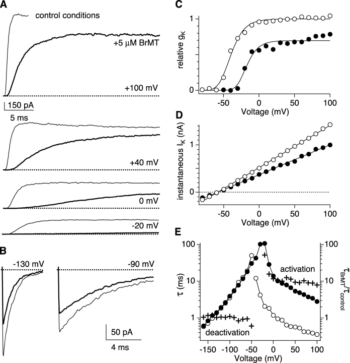 Figure 2. . Effects of 5 μM BrMT applied externally to ShBΔ channels. Data in all panels are from the same outside-out patch. (A) IK activation during voltage steps from −100 mV to a series of voltages. Thin traces: control condition. Thick traces: 5 μM BrMT. (B) IK deactivation after activating pulses to +20 mV. (C) Conductance-voltage relations from tail currents determined in the absence and presence of BrMT. Lines are fits of a fourth-power of a Boltzmann function (control: V1/2 = −59, z = 2.1; 5 μM BrMT: V1/2 = −3.4, z = 2.5). (D) BrMT does not affect rectification or reversal potential. Instantaneous I-V plot was constructed from tail current amplitudes after an activating pulse to +20 mV. Open circles: control condition. Filled circles: 5 μM BrMT. Lines are linear fits to the data. Reversal potentials from these fits are −58.2 mV (control) and −58.1 mV (BrMT). (E) Voltage dependence of activation and deactivation kinetics in the absence and presence of BrMT. Activation time constants were determined by a single exponential fit to the final 50% of the IK waveform. Deactivation time constants were determined by a single exponential fit to the entire decay of IK after an activating pulse to +20 mV. Open circles: τcontrol, control condition. Filled circles: τBrMT, 5 μM BrMT. Crosses: τBrMT/τcontrol.