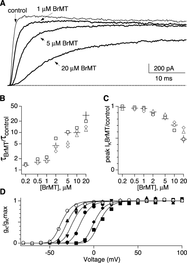 Figure 3. . Concentration dependence of external BrMT. Doseâresponse data from outside-out patches containing ShBÎ. (A) Thin trace: ShBÎ IK in response to a voltage step from â100 to +40 mV. Thick traces: IK at +40 mV in BrMT. (B) Slowing of IK activation by BrMT at +40 mV is plotted as the ratio of time constants from fits to activation kinetics (ÏBrMT/Ïcontrol). Different symbols represent values from different patches that underwent the entire doseâresponse. Crosses represent mean ± SE from 4â9 patches. (C) Effect of BrMT on peak IK amplitude. Peak IK was measured at +40 mV. Symbols correspond to same patches as in B. Crosses represent mean ± SE from 4â10 patches. (D) Conductance-voltage relations determined from different concentrations of BrMT applied to a single patch. Conductance values are from tail currents at â100 mV. Data at each concentration were normalized to the peak amplitude of a fourth-power Boltzmann fit (lines). Fits to BrMT data were constrained to have the steepness of the fit to control data (z = 3.4). V1/2 values from the fourth-power fits: control (open circles) = â49 mV; 1 μM (triangles) = â42 mV; 2 μM (inverted triangles) = â36 mV; 5 μM (filled circles) = â27 mV; 10 μM (diamonds) = â12 mV; 20 μM (squares) = â6 mV.