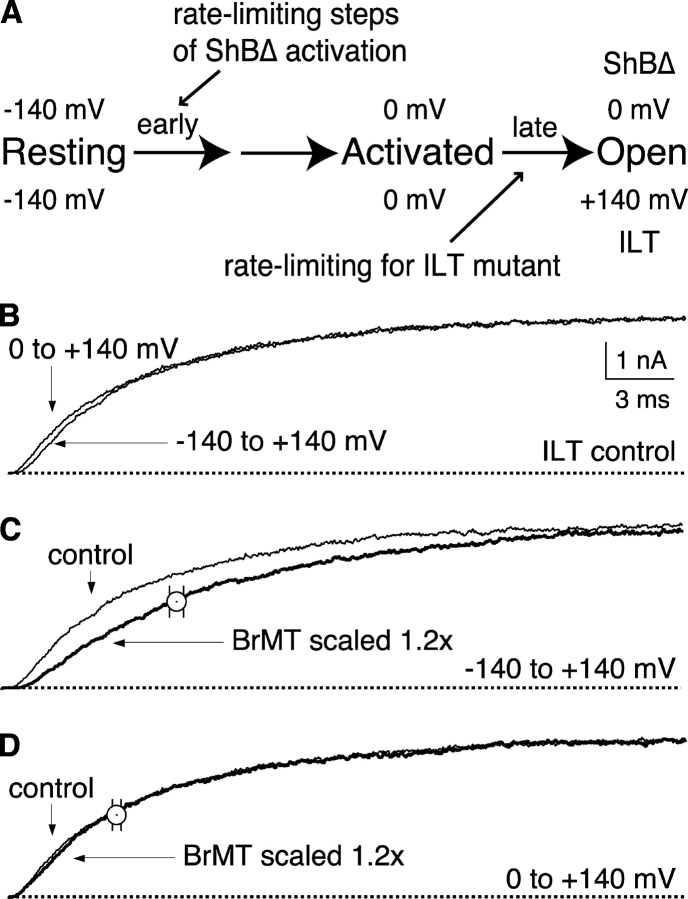 Figure 6. . BrMT slows early but not late activating transitions of ShBΔ ILT. IK from ShBΔ V369I;I372L;S376T (ILT) in outside-out patches. HP = −60. Pipette solution did not contain TCEP. (A) Scheme depicting gating of ILT channels. (B) IK rise from ILT channels at +140 mV after 60-ms prepulses to either −140 or 0 mV. Note the slight delay apparent from −140 mV. (C) ILT activation during a step from −140 mV. IK in 5 μM BrMT is scaled to match peak control IK. Open circle: mean time to half maximal IK in 5 μM BrMT was 1.6 ± 0.2 times that of control, n = 5 patches. (D) ILT activation during a step from 0 mV. IK in 5 μM BrMT is scaled to match peak control IK. Note the near perfect IK overlay indicating that BrMT does not slow the late activation steps of the ILT channel. Open circle: mean time to half maximal IK in 5 μM BrMT was similar (1.1 ± 0.1 times control, n = 5 patches).