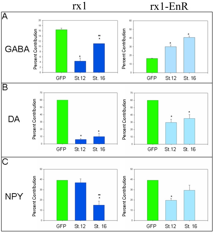 Both rx1 and pax6 are expressed during the initial formation of the vertebrate eye field, and they are thought to be crucial for maintenance of the retinal stem cells in the ciliary marginal zone. However, both genes continue to be expressed in different layers of the differentiating retina, suggesting that they have additional roles in cell type specification. Because previous work suggested that amacrine cell subtypes are derived from biased progenitors in the eye field, we tested whether altering Rx1 or Pax6 activity during eye field stages affects the production of three neurotransmitter subtypes of amacrine cells. Gain-of-function and loss-of-function hormone-inducible constructs of Rx1 and Pax6 were used to alter Rx1 and Pax6 protein or activity levels after the formation of the eye field. The major-retina producing blastomere of the 32-cell stage Xenopus embryo (D1.1.1) was injected with mRNA encoding one of these proteins and mRNA encoding GFP to label the altered lineage. Embryos were treated with synthetic hormone at either early (stage 12) or late (stage 16) eye field stages and they developed to tadpole stages (stage 44/45) when the cells in the central retina have differentiated. Amacrine cell subtypes (dopamine [DA], neuropeptide Y [NPY], gamma aminobutyrate acid [GABA]) were detected by immunofluorescence histology and the numbers of each type of cell produced within the affected lineage were counted. The percent contribution of the D1.1.1 lineage to a particular amacrine subtype after stage 12 or stage 16 hormone treatment were independently compared to those from gfp mRNA-injected control embryos that were similarly treated with hormone. Increasing Rx1 at early eye field stages promotes NPY amacrine cells and represses GABA and DA amacrine cells, and at late eye field stages significantly represses DA and NPY phenotypes but has a diminished effect on the GABA phenotype. Increasing Pax6 at early eye field stages represses NPY and DA amacrine cells but does not affect the GABA phenotype, whereas in the late eye field it significantly represses only the DA phenotype. Rx1 and Pax6 differentially modify the ability of eye field precursors to produce different neurotransmitter subtypes of amacrine cells. These effects varied for each of the subtypes investigated, indicating that amacrine cells are not all specified by a single genetic program. Furthermore, some cases were time-dependent, indicating that the downstream effects change as development proceeds.