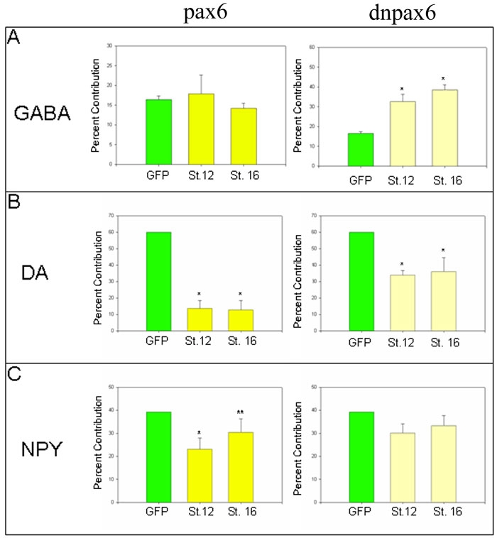 Changes in Rx1 and Pax6 activity at eye field stages differentially alter the production of amacrine neurotransmitter subtypes in Xenopus.