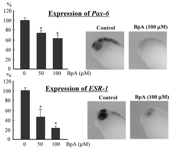 Bisphenol A (BpA) is widely used in industry and dentistry. Its effects on the embryonic development of Xenopus laevis were investigated. Xenopus embryos at stage 10.5 were treated with BpA. Developmental abnormalities were observed at stage 35; malformation of the head region including eyes and scoliosis. The expression of several markers of embryonic development was investigated by reverse transcription-polymerase chain reaction (RT-PCR). The pan-neural marker SOX-2, the neural stem cell marker nrp-1, the mesodermal marker MyoD, and the endodermal marker sox17alpha, were used. Although the expression of marker genes was not changed by treatment with BpA, that of Pax-6, a key regulator of the morphogenesis of the eyes, was decreased by BpA. Pax-6 is a downstream factor of Notch signaling. So, the expression of a typical Notch-dependent factor, ESR-1, was investigated in the presence of BpA. The expression of ESR-1 was efficiently suppressed by BpA. In whole mount in situ hybridization (WISH), Pax-6 was expressed in the central nervous system and eyes. The expression was lost completely on treatment with BpA. The expression of ESR-1 in the central nervous system and eyes also disappeared with BpA treatment. Injection of the intracellular domain of Notch efficiently recovered ESR-1 expression in the presence of BpA although injection of a ligand for notch, Delta, did not. These results suggest that BpA decreased the expression of ESR-1 by disrupting the Notch signal.
