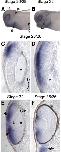 Fig. 4. Expression of BmprII mRNA in the developing Xenopus eye. (A) Stage 30 Xenopus embryo processed for BmprII in situ hybridization. BmprII transcripts are expressed in the eye (outlined by dotted line). (B,C, E,F) Ubiquitous expression of BmprII mRNA in the stage 28 retina (B) becomes refined to the inner layers of the neural retina and the lens at stage 30 (C), 33/34 (E) and 35/36 (F). Expression is absent from the emerging photoreceptors in the outer nuclear layer (onl). (D) A retina immunolabeled for Islet-1 shows the location of the RGCs in the inner- most layer of a stage 33/34 retina. Scale bar in (B) is 50 μm for panels (B- F). Abbreviations: D, dorsal; V, ventral; h, heart; L, lens; nr, neural retina; onl, outer nuclear layer; ot, otic vesicle; rgcl, retinal ganglion cell layer; rpe, retinal pigment epithelium.