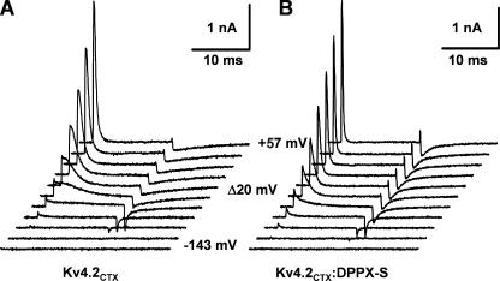 Figure 2. Ig from Kv4.2CTX and Kv4.2CTX:DPPX-S channels. (A) Ig from Kv4.2CTX channels expressed in tsA201 cells in the presence of 100 nM CTX and 105 mM intracellular CsF. From a holding potential of −153 mV, currents were elicited by a series of 12-ms voltage steps between −143 and +57 mV in 20-mV increments. (B) Ig from Kv4.2CTX:DPPX-S channels recorded under conditions identical to those used in A. Note the acceleration of the Ig-ON and Ig-OFF kinetics in the presence of DPPX-S.