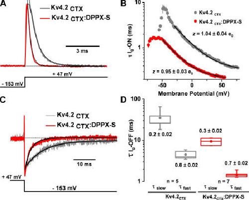 Figure 5. Kv4.2CTX Ig kinetics in the absence and presence of DPPX-S. (A) Ig elicited by a voltage step to +47 mV from a holding potential of −153 mV for both Kv4.2CTX (gray traces) and Kv4.2CTX:DPPX-S (red traces) channels. Note the accelerated decay of the Kv4.2CTX:DPPX-S Ig. Continuous black lines represent the best-fit exponential decays. The dotted line is the zero-current level. (B) Time constants resulting from the exponential fits plotted against membrane potential. The continuous black lines represent the best-fit exponential (see Materials and methods). Near the midpoint voltage of the QON-V relationships (data points excluded from the exponential fit), the Ig relaxations were described by assuming the sum of two exponential terms; thus, the corresponding data points are the weighted means of the time constants. Note that at all voltages, the Kv4.2CTX:DPPX-S Ig-ON exhibits faster time constants than its Kv4.2CTX counterparts. The effective valences derived from this analysis were 1.04 ± 0.04 e0 for Kv4.2CTX (n = 6) and 0.95 ± 0.03 e0 for Kv4.2CTX:DPPX-S (n = 7). (C) OFF Ig from both Kv4.2CTX (gray traces) and Kv4.2CTX:DPPX-S (red traces) channels resulting from a repolarizing voltage step from +47 mV to −153 mV. Continuous black lines represent the best-fit sum of two exponential terms. (D) Box plot of the Ig-OFF time constants (repolarizations to −153 mV from +47 mV). The borders of the boxes represent the 25th and 75th percentiles, whereas the median and mean are represented by a closed circle and a horizontal line in the box, respectively. Error bars represent the 5th and 95th percentiles, respectively. The fractional amplitudes of the exponential terms are indicated by the numbers displayed below or above the corresponding boxes.