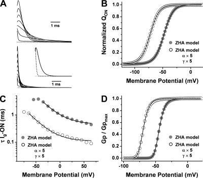 Figure 6. Kinetic modeling of voltage-dependent gating in the absence and presence of DPPX-S. All simulations assume the ZHA model of Kv channel gating and were conducted as described in Materials and methods. (A) Simulated Ig evoked by 6-ms step depolarizations (top, −55 to +65 mV; bottom, −75 to +65 mV; both in 20-mV increments) to the indicated membrane potentials and assuming a holding potential of −153 mV. The top and bottom families of traces simulate Kv4.2 Ig in the absence and presence of DPPX-S, respectively. The simulation parameters are those reported in Table I of Zagotta et al. (1994), except that for the bottom family of traces, the forward rate constants (α and δ) of the two sequential transitions in each subunit of the channel were increased fivefold. The inset compares control (continuous line) and accelerated (dashed line) Ig evoked by depolarizations to +45 mV. In all plots (B–D), the simulations that assume accelerated gating are depicted by open symbols. (B) Simulated QON-V relationships. QON was simulated in 2-mV increments. The continuous lines superimposed on the simulated data symbols are best-fit Boltzmann functions (see Materials and methods) with the following parameters: V1/2 (closed symbols) = −48 mV and z (closed symbols) = 3.2 e0; and V1/2 (open symbols) = −73 mV and z (open symbols) = 3.2 e0. The ΔV1/2 = −25 mV. (C) Simulated time constant–voltage relationships. The time constants were derived by approximating the simulated Ig relaxations with an exponential function (as done for the observed Ig; see Results). The initial fast phase at low voltages and the rising phase at high voltages were excluded from this analysis. The continuous lines superimposed on the simulated data symbols are best-fit exponential functions that describe the voltage dependence of the time constants (see Materials and methods). The effective valences derived from this analysis were 1.08 e0 (closed symbols) and 1.09 (open symbols) e0. (D) Simulated G-V relationships. The plots were generated from the steady-state level of the simulated ionic currents at the indicated membrane potentials (2-mV increments). The chord conductance (G) was calculated by assuming a reversal potential of −100 mV. The continuous lines superimposed on the simulated data symbols are the best-fit fourth-order Boltzmann functions with the following parameters: V1/2 (closed symbols) = −45 mV and k (closed symbols) = 5.4 mV; and V1/2 (open symbols) = −70 mV and k (open symbols) = 5.5 mV. V1/2 is the calculated voltage at Gp/Gpmax = 0.5, and k is the slope factor. The ΔV1/2 = −25 mV.