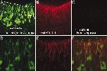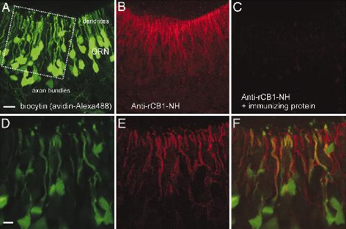 CB1 distribution in the OE of X. laevis tadpoles. (A) Slice of an OE with biocytin-avidin-stained ORNs (merged z-stack; 16 optical slices, total thickness 14.4 μm). (Scale bar: 20 μm.) (B) Immunoreactivity to an rCB1-NH antibody of the same slice (see Materials and Methods). (C) Merged z-stack of an OE treated with the anti-CB1 antibody after preadsorption with the immunizing protein (see Materials and Methods). (DâF) Higher magnification of the region indicated by the white rectangle in A (merged z-stack; four optical slices, total thickness 3.6 μm). (Scale bar: 10 μm.) (E) CB1-LI IR localized to dendritic processes. The somata of the ORNs are clearly IR-free. (F) Overlay of D and E. CB1-LI IR is clearly occurring at ORN dendrites.
