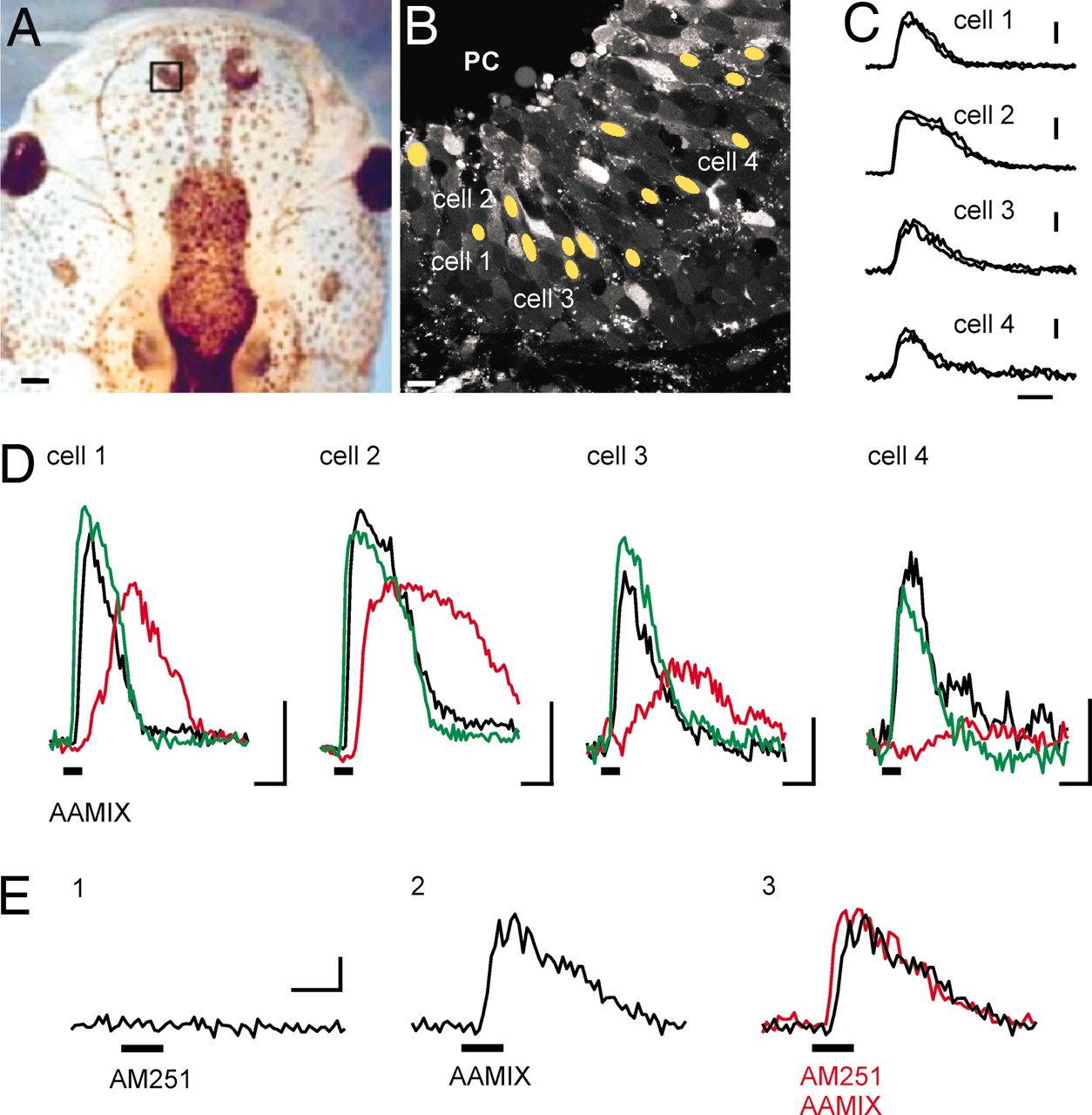 AM251 alters odor-evoked [Ca2+]i changes. (A) Overview of a X. laevis tadpolehead. The black rectangle indicates part of the animal's left OE. (Scale bar: 500 μm.) (B) Fluo4-AM stained acute slice preparation of the OE (image acquired at rest). PC, principal cavity. The yellow ovals indicate the ORN somata of this slice that responded to the AAMIX (100 μM). (Scale bar: 10 μm.) (C) [Ca2+]i transients of individual ORNs upon repeated applications of the AAMIX. The intraepithelial location of the four cells shown is indicated in B. [Scale bars: 10 s and δF/F 100% (cells 1 and 2) and 10 s and δF/F 50% (cell 3 and cell 4).] (D) After addition of AM251 (5 μM) to the bath solution the AAMIX-evoked ORN responses (black traces) were modulated (red traces). After 12 min of drug washout the odor-induced [Ca2+]i transients recovered completely (green traces). [Scale bars: 10 s and δF/F 100% (cells 1 and 2) and 10 s and δF/F 50% (cells 3 and 4).] (E) AM251 does not interfere with odorant binding at olfactory receptors. Application of AM251 (50 μM) alone (E1) did not elicit any response. (E2 and E3) Odorant-induced [Ca2+]i transient upon application of the AAMIX (50 μM) alone (E2) and [Ca2+]i transient induced by a coapplication of the antagonist (AM251, 50 μM) and 50 μM AAMIX (E3). The reproducibility of the [Ca2+]i transients was not altered by the presence of the antagonist (compare black and red traces). (Scale bars: 10 s and δF/F 100%.)