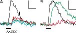 CB1 receptor-mediated antagonist action upon amino acid-sensitive ORNs. (A) The modulatory effects of AM281 (10 μM; red trace) on an AAMIX-evoked ORN response (black trace) could not be washed out within 2 or 5 min with bath solution alone (green trace and blue trace, respectively). (B) [Ca2+]i transient of an individual ORN upon application of the AAMIX (black trace). After addition of AM281 (10 μM) to the bath solution the AAMIX-evoked ORN response was suppressed (red trace). After 2 min of drug washout with HU210 (20 μM) in the bath solution, the odor-induced [Ca2+]i transient recovered almost completely (green trace). [Scale bars: 10 s and δF/F 50% (A) and 10 s and δF/F 100% (B).]