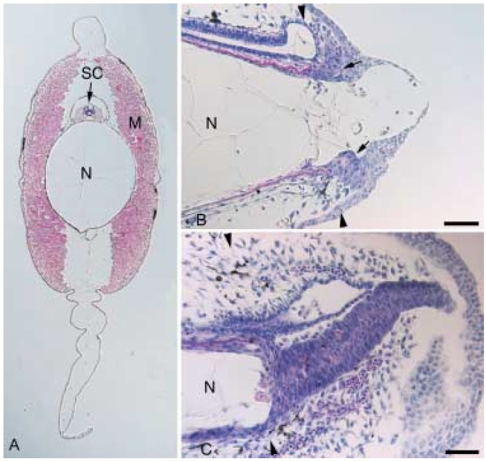 Fig. 1. Morphology of normal and regenerating tail of Xenopus tadpole. (A) Transverse section of a stage 50 tadpole tail was stained with hematoxylin and eosin. (B, C) Sagittal sections of the regenerating tail at days 2 and 3 after amputation. The pair of arrowheads indicates the amputation plane. Arrows in (B) indicate cell masses of the notochord precursor. The dorsal side is up and the anterior side is to the left in (B) and (C). N, notochord; SC, spinal cord; M, muscle mass. Scale bar, 50 μm.