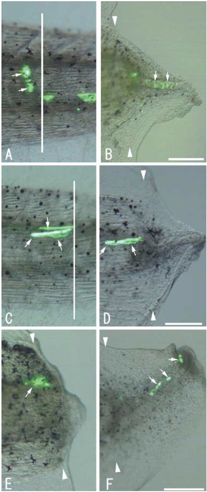 Fig. 2. Lineage analyses during the tail regeneration. Arrows in (A) indicate green fluorescent protein (GFP)-labeled notochord cells before amputation. (B) The same tadpole shown in (A) at day 4 after amputation. All of the GFP-labeled cells were found in the regenerating notochord. Arrows in (C) indicate three muscle fibers labeled with GFP. (D) The same tadpole as shown in (C) at day 5 after amputation. Two labeled cells were not changed while the other cell degenerated and was not found. (E, F) Spinal cord cells were electroporated after amputation and observed at day 2 (C) and day 7 (D). All the labeled cells were found in the regenerating spinal cord. The pair of arrowheads indicates the amputation plane. The dorsal side is up and the anterior side is to the left. Scale bar, 250 μm. The solution containing the expression plasmid pCAX-AFP (1 μg/μL) that coded for a mutant form of GFP (Inouye et al. 1997) was injected into the muscle, notochord or spinal cord region of a stage 48 tadpole anesthetized in MS222. The injected tadpole was covered with 0.1 × MMR saturated papers and electroporated with an electroporator (ECM 830, BTX) by applying 10 pulses (30 V, 5 ms) according to the method of Momose et al. (1999). After confirmation of the GFP expression using a fluorescence microscope the tail was amputated at the plane indicated by a white line