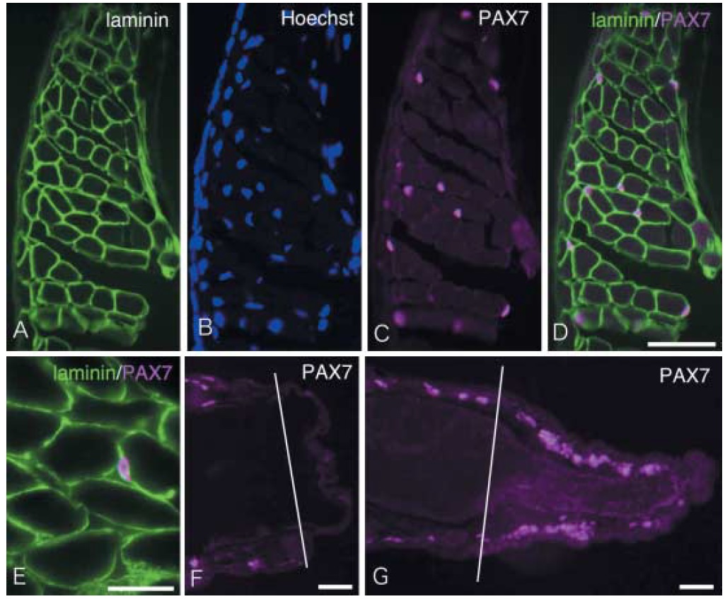 Fig. 3. PAX7 expression during tail regeneration. A frozen crosssectionof the tail muscle region was stained with anti-laminin antibody (A), Hoechst 33342 (B) and anti-PAX7 antibody (C). (D) Merged image of (A) and (C). The subpopulations of muscle nuclei were labeled with ani-PAX7. (E) Higher magnification view of a section immunostained for laminin (green) and PAX7 (magenta). A PAX7-labeled cell is situated underneath the myofiber basement membrane visualized with antilaminin antibody, suggesting that it is the muscle satellite cell. (F, G) Horizontal sections of amputated tail at days 1 (F) and 3 (G) were stained with anti-PAX7 antibody.