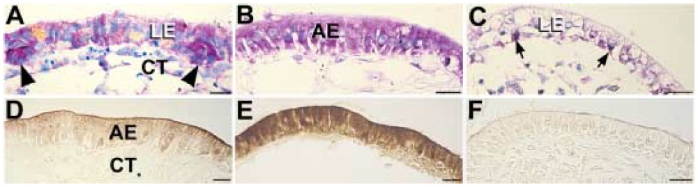 (LE) and the connective tissue (CT) (A) and then differentiate into the absorptive epithelium expressing IFABP (D). (B, E) In the