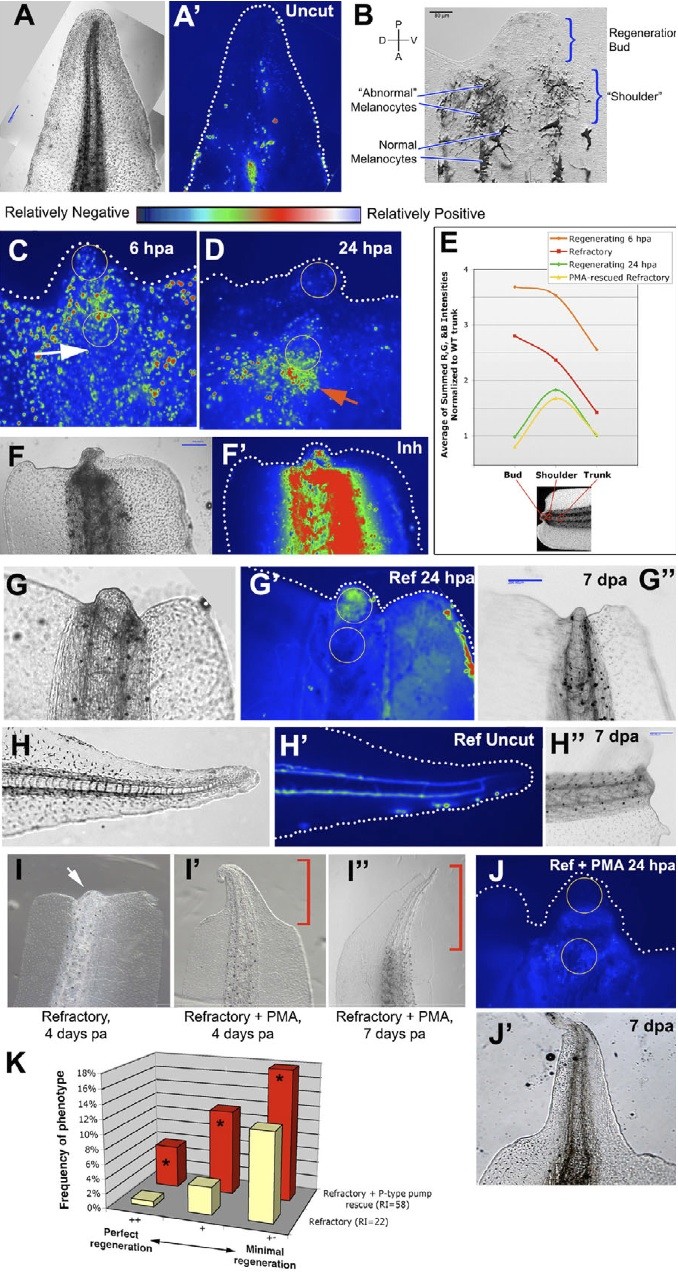 (I) Refractory tail shown 4 dpa. (I P-type pump- expressing tail, 4 dpa at the refractory stage. (I') P-type pump-expressing tail, 7 dpa at the refractory stage, showing full regeneration. Red bracket indicates newly regenerated tissue absent in control tails. (J) DiBAC reveals that, unlike control refractory tails (G'), the bud of PMA-expressing refractory tails is relatively polarized, as with tails cut at st. 41 (D). Yellow circles indicate ROIs. (J') The same tail as J, showing significant regeneration at 7 dpa. (K) Analysis of the rescue of regeneration in refractory tails by misexpression of a yeast P-type H+ pump. Off-white bars, refractory tails; red bars, PMA-injected tails. Injection of PMA caused a significant augmentation of the ability of refractory tails to regenerate. *, indicates significantly different from controls (see Table S2 in the supplementary material). |