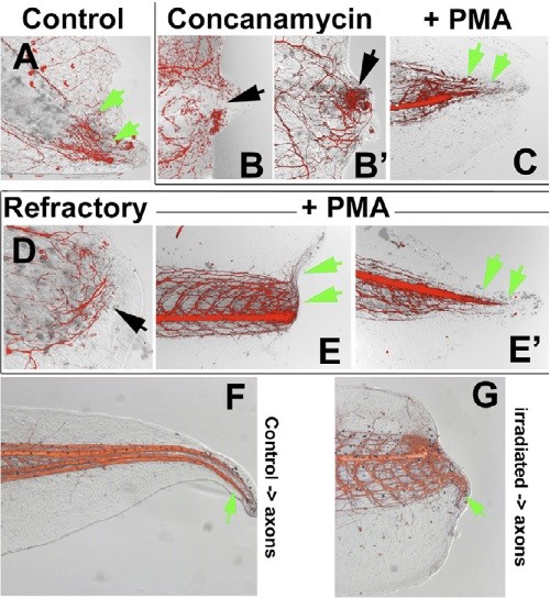 Fig. 5. Axonal growth pattern is dependent on H+ fluxes. Green arrows indicate normal axon patterning; black arrows indicate abnormal axon number and/or location. (A) The normal pattern of regenerating axons is parallel to the main body axis, extending to the tip of the bud at 72 hpa. This is altered in V-ATPase-inhibited tails, where axons are absent from the central core of the new tissue of partial regenerates at 72 hpa (B), or are present in a tangled mass and not aligned parallel to the tail primary axis (B'). The expression of the concanamycin-insensitive yeast PMA H+ pump in the tail can rescue the normal axonal patterning (C). (D) In refractory-stage larvae, axons terminate in a loop at a considerable distance from the edge, and perpendicular to the main tail axis. Expression of PMA rescues the neuronal phenotype, resulting in axon growth to the very edge of the wound in non-regenerating tails (E), and parallel outgrowth of axons into the new tissue of regenerates (E'). The normal pattern of axons, reaching to the end of the tissue at 7 dpa (F), is not affected by irradiation (G), which abolishes cell proliferation and regeneration; axons reach to the distal edge of the irradiated tissue. Tails shown in A-E are 72 hpa; those in F-G are 7 dpa. |