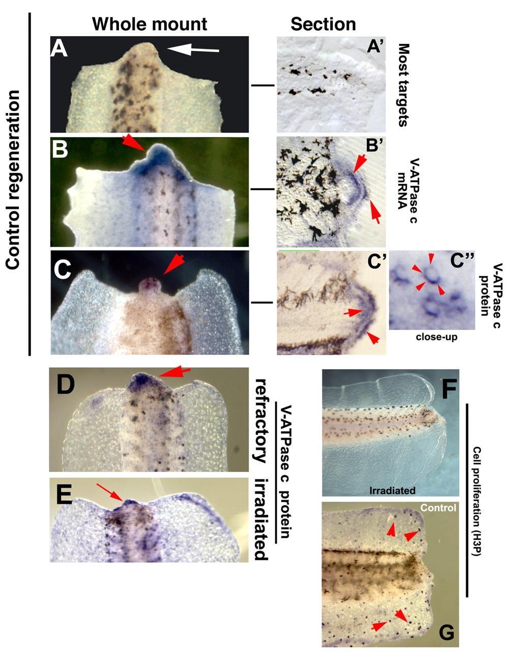 Fig. 2. Characterization of V-ATPase expression and physiology. Whereas NaV1.5 (A,Aâ²) and most transporter genes tested, including Kir6.2 and subunits of the H+/K+-ATPase, are absent, both V-ATPase mRNA and protein are detected in the regeneration bud (B,Bâ²,C,Câ²). High magnification of section reveals the predicted cell-membrane localization for the protein (Câ²; scale similar to Fig. 1Fâ²). (D) As in regenerating tails, amputation during the refractory period (st. 46) results in V-ATPase protein expression at 24 hpa. The same is true in irradiated larvae examined at 48 hpa (E), which exhibit no cell proliferation, as detected by the phosphorylated Histone H3B marker (F, compare with normal pattern of proliferation in G). Sections were generated as described by Levin (Levin, 2004). Larvae shown in A-E are oriented with anterior towards the bottom; sections Aâ²,Bâ²,Câ²,Fâ²,Gâ² are oriented with anterior to the right and dorsal upwards. Larvae in F,G are shown at 48 hpa. White arrowhead points to regeneration bud with lack of expression. Red arrows and arrowheads indicate positive signal (expression of RNA or protein marker). |