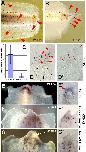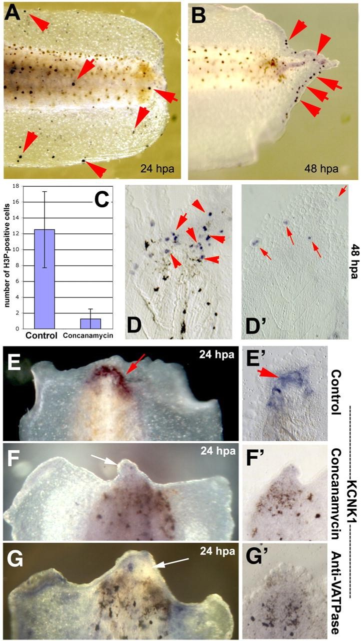 Fig. 4. V-ATPase function is required for the upregulation of cell proliferation in the tail regeneration bud. Proliferating cells were labeled with immunohistochemical staining for phosphorylated Histone H3B (H3-P). (A) At 24 hpa, proliferating cells in the G2-M transition are randomly distributed. (B) By 48 hpa, the proliferating cells cluster in the regeneration bud and have largely disappeared from the caudal flank. Red arrows indicate H3P-positive cells. (C) Incubation in concanamycin immediately after amputation reduces proliferation in the bud; sample proliferation data are from D (control) and Dâ² (concanamycin-treated) larva. A,B are oriented anterior to the left; all other panels are oriented anterior upwards. n=8 for each condition. (E-Gâ²) KCNK1 expression requires V-ATPase activity. The regeneration bud normally expresses the KCNK1 channel by 24 hpa (E,Eâ²). By contrast, larvae in which the V-ATPase was inhibited by concanamycin (F,Fâ²) or anti-c subunit antibody (G,Gâ²) exhibit no KCNK1 expression at 24 hpa. n=10 for each condition. White arrows indicate lack of expression; red arrows indicate positive signal (expression of KCNK1). |