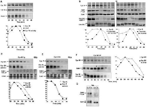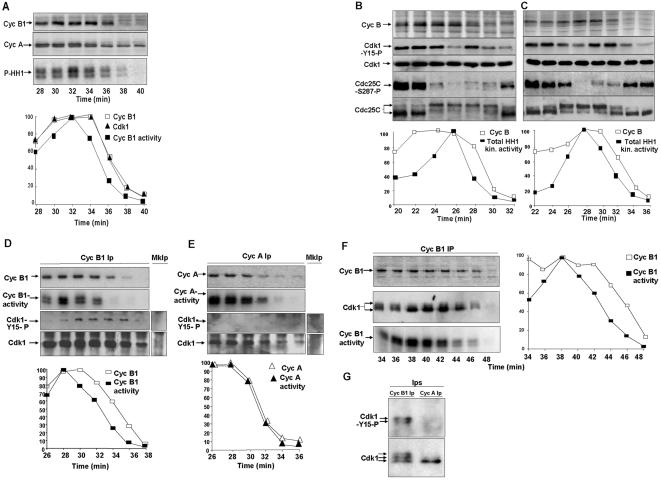 Figure 1. Cyclin B1, cyclin A abundance and MPF activity in cycling extracts. (A) Left panels, Cyclin B1 and cyclin A were visualised by immunoblot and total histone H1 kinase activity by autoradiograph of phosphorylated histone H1 (P-HH1) from samples of a cycling extract taken at the indicated time points during incubation at 23°C. Right panels, quantisation (percent of peak value) of cyclin B (open squares; from immunoblot in the left panel), cyclin B1-bound cdk1 (filled triangles; from cdk1 immunoblot of cyclin B1 immunoprecipitates; Ips) and histone H1 kinase (filled squares; autoradiographs of histone H1 kinase assayes from cyclin B1 Ips). (B, C) Left panels, cyclin B (extracts proteins autoradiograph; cyclin B position is indicated) and cdk1-phospho-tyr15 (Cdk1-Y15-P), cdk1 (Cdk1), cdc25C-phospho-ser-287 (Cdc25C-S287-P), cdc25C (Cdc25C) contents (immunoblot) from samples of two independent cycling extracts, incubated in the presence of [35S]methionine, taken at 2 min intervals. Right panels, quantisation of total extract histone H1 kinase (filled squares) and cyclin B (open squares) from the same samples. (D) Upper panels, cyclin B1, cyclin B1-associated kinase activity (Cyc B1-activity; phosphorylated histone H1 autoradiograph), cdk1-phospho-tyr-15 and cdk1 contents in cyclin B1 Ips from samples of an extract, incubated in the presence of [35S]methionine, taken across the mitosis-interphase transition. Lower graph, quantisation, expressed as percent of peak value, of cyclin B1 content (open squares) and cyclin B1-associated kinase activity (filled squares). (E) Upper panels, cyclin A (Cyc A) and cyclin A-associated kinase activity (Cyc A-activity; phosphorylated histone H1 autoradiograph), cdk1-phospho-tyr-15 and cdk1 contents in cyclin A Ips from the samples described in Fig 1D. Lower graph, quantisation, expressed as percent of peak value, of cyclin A content (open triangles) and cyclin A-associated kinase activity (filled triangles). (F) Samples from a cycling extracts, incubated in the presence of [35S]methionine, were taken at 2 min intervals. Samples were immunoprecipitated with an anti cyclin B1 antibody. Left panels, cyclin B1 (Cyc B1; autoradiograph), cyclin B1-associated cdk1 (Cdk1) was visualised by immunoblotting after resolving cyclin B1 Ips by long SDS-PAGE runs and cyclin B1-associated histone H1 kinase activity (Cyc B1 activity; autoradiograph). Right, quantisation of the autoradiographs of labelled cyclin B1 (open square) and phosphorylated histone H1 (filled square). From 34 to 38 min, the fastest migrating, dephosphorylated, cdk1 form accumulated as activity reached the maximum (38 min). Subsequently (40, 42, 44, 46 min), the slower migrating, phosphorylated, cdk1 forms reappeared as activity begun declining. (G) Cyclin B1 (Cyc B1 Ip) and cyclin A (Cyc A Ip) Ips from samples of a cycling extract taken 2 min after the cyclin B1-cdk1 activity peak. The cdk1-phospho-tyr-15 (Cdk1-Y15-P) and cdk1 were visualised by immunoblot after resolving the Ips by long SDS-PAGE runs. Since cyclin A is about 5 fold less abundant than cyclin B1 and cyclin A degradation was already started in the samples used, cyclin A Ips were from 6 times more extract sample than for cyclin B1 Ips to have comparable amounts of cdk1 on the blot.