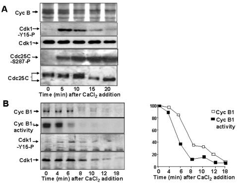 Figure 2. Cyclin B1 abundance and MPF activity in CSF-arrested extracts. (A) Cyclin B, cdk1-phospho-tyr15, cdk1, cdc25C-phospho-ser-287 and cdc25C contents from total extract samples of a CSF-arrested extract, pre-incubated with [35S]methionine, at the indicated time points after CaCl2 addition. (B) Left panels, cyclin B1, cyclin B1-associated kinase activity, cdk1-phospho-tyr15 and cdk1 contents in cyclin B1 Ips from CSF-arrested extract samples at the indicated time points after CaCl2 addition. Right, quantisation of cyclin B1 content (open squares), cyclin B1-associated kinase activity (filled squares) from cyclin B1 Ips.