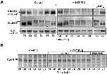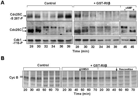 Figure 3. MPF hampers Cdc20-APC/C interaction. (A) Cdc25C-phospho-ser-287, cdc25C and cdk1-phospho-tyr15 contents during incubation time of a control cycling extract, treated with GST, and a portion of the same extract treated with GST-RIIβ (+GST-RIIβ) to inhibit PKA. To a portion of the GST-RIIβ-treated extract, cAMP (4 µM) was added at 40 min of incubation, to reactivate PKA, and samples taken at 45 min (-+cAMP). (B) Cyclin B stability during incubation time in a control extract and in portions of a GST-RIIβ-treated extract to which either roscovitine (2 µM; 1/30 extract volume), to inhibit cdk activity, or DMSO (1/30 extract volume), as control, were added.