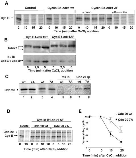 Figure 4. MPF hampers Cdc20-APC/C interaction through Cdc20 phopshorylation. (A) Cyclin B stability after CaCl2 addition in [35S]labelled CSF-arrested extract portions treated with buffer, as control, recombinant cyclin B1-cdk1wt or cyclin B1-cdk1AF complexes. To portions of the cyclin B1-cdk1AF-treated extract, either roscovitine (2 µM; 1/30 extract volume), or DMSO (1/30 extract volume) as control, were added 1 min after CaCl2. (B) Total Cdc27 and Cdc27-bound Cdc20 (IpCdc27/IbCdc20) from CSF-arrested samples treated with recombinant cyclin B1-cdk1wt and cyclin B1-cdk1AF complexes at the indicated time points after CaCl2 addition (the time 0 sample received no CaCl2). [35S]labelled Cdc20 wild type (wt) and a 7 phosphorylation sites mutant version (7A) were produced in reticulocyte lysates (lanes 1, 2). Labelled proteins were incubated with portions of a CHX-treated CSF-arrested extract for 30 min (lanes 3, 4). Cdc27 was, then, immunoprecipitated (Cdc 27 Ip) and the amount of bound wt (lane 7) and 7A (lane 8) Cdc20 detected by autoradiography. Lanes 5, 6, mock Ips (Mk Ip). (C) Portions of a [35S]labelled CSF-arrested extract were incubated for 40 min with mock (contr.), cdc20 wt or cdc20 7A programmed reticulocyte lysates in the presence of CHX. (D) The cdc20 wt- and cdc20 7A-treated portions where further incubated for 20 min with cyclin B1-cdk1AF. Then, aliquots were taken at the indicated time points after CaCl2 addition. Shown is an autoradiograph of [35S]labelled extracts proteins (the position of cyclin B is indicated). (E) Quantisation of remaining cyclin, expressed as percent, from cyclin B1-cdk1AF-treated extract portions in the presence of cdc20 wt (open squares) or cdc20 7A (filled squares). Error bars refer to variability within three independent experiments.