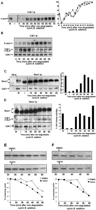 Figure 5. Wee1 and cdk1 physically interact in M-phase. (A) Histone H1 kinase activity in cdk1 Ips from samples of CSF-arrested extract (M), interphase extract (I; 40 min after CaCl2 and CHX additions) and from samples taken at the indicated time points after sea urchin ΔB (100nM) addition to an interphase extract. Left panel, phosphorylated histone H1 autoradiograph (P-HH1). Right panel, quantisation of cdk1 activity from three independent experiments. (B) Cdk1 activity, cdk1-phospho-tyr15 and cdk1 content in cdk1 Ips from extract samples taken at the indicated time points after ΔB addition. (C, D) Wee1 and cdk1 were immunoprecipitated from samples of CSF-arrested (M), interphase (I) extracts and interphase extract samples from the time of ΔB addition. Left panels, wee1 and wee1-associated cdk1 in wee1 Ips. Right, histone H1 kinase activity in cdk1 Ips. In (D) the lower part of the wee1 Ips immunoblot was first probed for cdk1-phospho-tyr15 and subsequently for cdk1. (E, F) Full-length, [35S]labelled, Xenopus cyclin B1 was added to two independent interphase extracts along with ΔB. The extracts were spilt into two portions and DMSO, as control, or roscovitine (10 µM) were added after 33 min incubation, samples were, then, taken at the indicated time points after ΔB addition. Shown are autoradiographs and quantisations of percent remaining [35S]labelled, full-length cyclin B1.