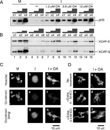 Figure 2. Stimulation of chromosomal binding of condensin I by OA in interphase extracts. (A) Sperm nuclei were incubated with mitotic extract (lanes 1–3), interphase extract (lanes 4–6), interphase extract supplemented with 1.2 (lanes 7–9), 3.6 (lanes 10–12) or 12 μM (lanes 13–15) of OA at 22°C for 2 h. Chromatin-bound proteins were dissolved with SDS-PAGE sample buffer, and 12.5 (lanes 1, 4, 7, 10 and 13), 25 (lanes 2, 5, 8, 11 and 14) and 50% (lanes 3, 6, 9, 12 and 15) of each sample were separated by SDS–PAGE, and immunoblotted with anti-phospho H3. (B) Samples were prepared as described in (A), and 6.25% (lane 1), 12.5% (lanes 2, 4, 7, 10 and 13), 25% (lanes 3, 5, 8, 11 and 14) and 50% (lanes 6, 9, 12 and 15) of samples were blotted using anti-XCAP-E (upper), and anti-XCAP-G (lower) antibodies. (C) Sperm chromatin was assembled in the mitotic extract (a, d), interphase extract (b, e, g), and interphase extract supplemented with 3.6 μM OA (c, f, h). Samples were fixed and stained with Hoechst (a, b, c; first low), and anti-XCAP-H antibody (d, e, f; second low, short exposure: g, h; third low, long exposure). Bar, 10 μm. (D) Sperm chromatin was assembled in the mitotic extract (a, c, e) or interphase extract supplemented with 3.6 μM OA (b, d, f). After assembly, the reaction mixtures were supplemented with the indicated extra concentration of KCl at 22°C for 20 min, fixed, and stained with Hoechst. Bar, 10 μm. |