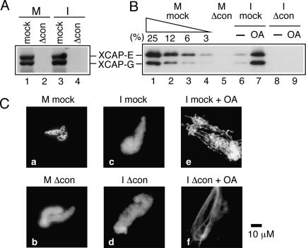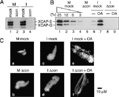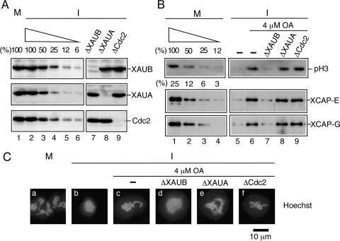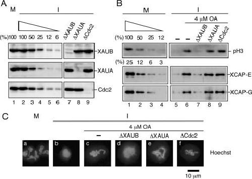 Figure 3. Requirement of condensin in OA-dependent partial chromosome condensation in the interphase extract. (A) Mitotic (lanes 1–2) and interphase (lanes 3–4) extracts were mock-depleted (lanes 1 and 3) or depleted with a mixture of affinity-purified condensin antibodies (lanes 2 and 4). Equal volumes of these extracts were subjected to SDS-PAGE, blotted, and detected using the indicated antibodies. (B) Sperm chromatin was incubated with mock-depleted mitotic extract (lanes 1–4), condensin-depleted mitotic extract (lane 5), mock-depleted interphase extract (lane 6), mock-depleted interphase extract supplemented with OA (lane 7), condensin-depleted interphase extract (lane 8) or condensin-depleted interphase extract supplemented with OA (lane 9) at 22°C for 2 h. The assembled structures were isolated, and 25 (lane 1), 12.5 (lane 2), 6.3 (lane 3), 3.1 (lane 4) and 100% (lanes 5–9) were analyzed by immunoblotting with the indicated antibodies. (C) Sperm chromatin was incubated with mitotic extract (a), condensin-depleted mitotic extract (b), mock-depleted interphase extract (c), mock-depleted interphase extract with OA (d), condensin-depleted interphase extract (e), or condensin-depleted interphase extract with OA (f) at 22°C for 2 h. After incubation, assembled chromatin structures were fixed and stained with Hoechst. Bar, 10 μm. |