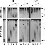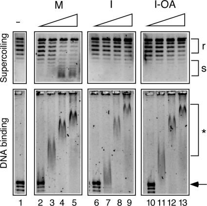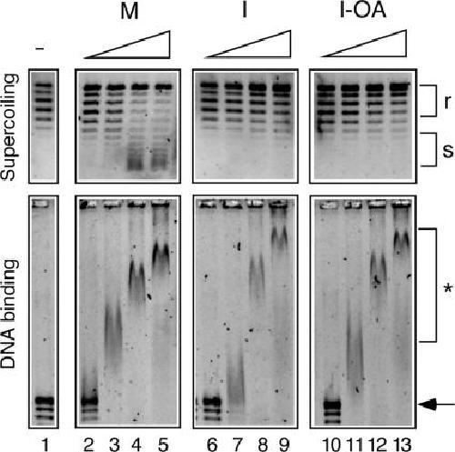Figure 5. Effect of OA on the supercoiling activity of condensin I. Condensin I was affinity-purified from mitotic (lanes 2–5), interphase (lanes 6–9), or OA-treated interphase extract (lanes 10–13) and standard supercoiling (upper) and DNA binding assays (lower) were performed; r, relaxed circular DNA; s, positively supercoiled DNA; arrow, free DNA; asterisk, DNA bound to condensin I. The approximate molar ratios of condensin I to DNA were 15:1 (lanes 2, 6 and 10), 30:1 (lanes 3, 7 and 11), 60:1 (lanes 4, 8 and 12) and 120:1 (lanes 5, 9 and 13). Condensin I was omitted from lane 1. |