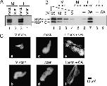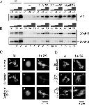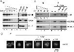 Figure 1. Effect of Aurora-B depletion on condensin I binding to chromosomes. (A) Mitotic extracts were depleted with control IgG (lane 7), anti-Aurora B (lane 8), anti-Aurora A (lane 9) and anti-Cdc2 (lane 10). Two microliter aliquots of each extract were analyzed by immunoblotting with the indicated antibodies. To estimate the efficiency of depletion, 2 μl (lane 1) of interphase extract, 2 μl (lane 2), 1 μl (lane 3), 0.5 μl (lane 4), 0.25 μl (lane 5) and 0.12 μl (lane 6) of mitotic extract were loaded in parallel (lanes 7–10). (B) Sperm nuclei were incubated with interphase extract (lane 1), mitotic extract (lanes 2–4), mock-depleted mitotic extract (lanes 5–7), Aurora B-depleted mitotic extract (lanes 8–10), Aurora A-depleted mitotic extract (lanes 11–13), or Cdc2-depleted mitotic extract (lanes 14–16). Assembled chromatin and chromosomes were isolated through a sucrose cushion, and 12.5% (lanes 2, 5, 8, 11 and 14), 25% (lanes 3, 6, 9, 12 and 15) and 50% (lanes 1, 4, 7, 10, 13 and 16) were separated by SDS-PAGE, and then detected by immunoblotting using anti-phospho H3 antibody (chromatin-bound; lower). To test the phosphorylation level in the extracts, 1 μl (lanes 2, 5, 8, 11 and 14), 2 μl (lanes 3, 6, 9, 12 and 15) and 4 μl (lanes 1, 4, 7, 10, 13 and 16) of the extracts were immunoblotted with anti-phospho H3 antibody (in extract; upper). (C) Chromatin-bound proteins were prepared the same as (B), and were separated by SDS-PAGE and immunoblotted by anti-XCAP-E (upper) or anti-XCAP-G antibodies (lower). (D) Sperm chromatin was incubated in interphase (a), mitotic (b), mock-depleted mitotic (c), Aurora B-depleted mitotic (d), Aurora A-depleted mitotic (e) or Cdc2-depleted mitotic (f) extracts at 22°C for 2 h, fixed, and then stained with Hoechst. |