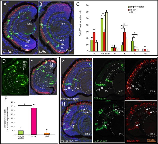 Transformation of undifferentiated progenitors into specific cell types is largely dependent on temporal and spatial expression of a complex network of transcription factors. Here, we examined whether neural retina leucine zipper (Nrl) and photoreceptor-specific nuclear receptor Nr2e3 transcription factors contribute to cell fate determination. We cloned the Xenopus Nr2e3 gene and showed that its temporal and spatial expression is similar to its mammalian ortholog. We tested its in vivo function by misexpressing these transcription factors in Xenopus eye primordia, demonstrating that either human Nr2e3 or Nrl directed photoreceptor precursors to become rods at the expense of cones. Furthermore, overexpression of Xenopus Nrl dramatically increased the number of lens fibers, whereas human Nrl did not, suggesting evolutionary divergence of function of the Nrl gene family. Misexpression of Nrl and Nr2e3 together were more effective than either transcription factor alone in directing precursors to the rod fate.