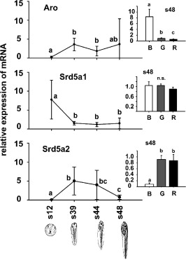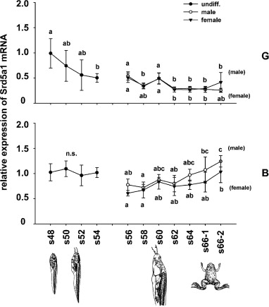 Relative mRNA expression of steroid-5-alpha-reductase type 1 (Srd5a1) mRNA in gonads with kidney (G, upper panel) and in brain (B, lower panel) of tadpoles of X. laevis during ontogeny corresponding to Fig. 4. Values are expressed as means ± SD derived from six individuals at each developmental stage. Significant differences between the developmental stages were indicated by different letters (p < 0.05).