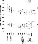 Relative mRNA expression of house-keeping genes, elongation factor-1α (EF), β-2-microglobulin (B2M), ornithine decarboxylase (ODC) and histone 4 (H4), in X. laevis tadpoles are shown during the first analyzed developmental stages according to Nieuwkoop and Faber (1994) from stage 12 to 48 of whole body homogenates (WB). Additionally, at stage 48 tadpoles were dissected in brain (B), gonads (G) and remaining tissue (R) and the mRNA expression was analyzed. Differences in EF and H4 mRNA expression were significant (p < 0.05) in the developmental period between stages 12 and 48, and therefore B2M was chosen as house-keeping gene for this period being more constantly expressed than ODC.