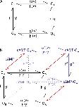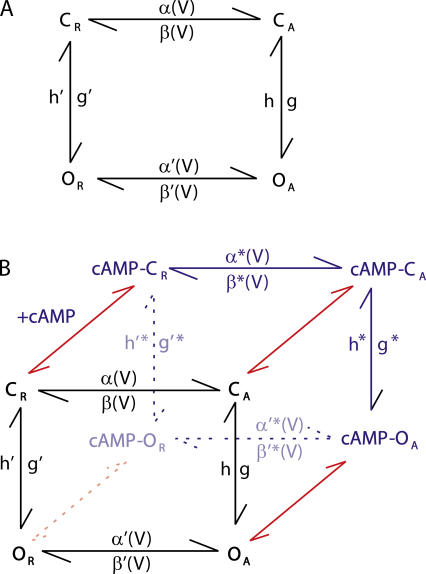 Figure 1. Four-state and eight-state allosteric models for regulation of HCN2 opening by voltage and cAMP. (A) The four-state cyclic allosteric scheme for channel opening in the absence of cAMP. The vertical transitions represent the voltage-independent opening and closing reactions. The horizontal transitions are voltage-dependent activation steps that reflect voltage sensor movements. α and β are the voltage-dependent rate constants for activation and deactivation, respectively, for the closed state of the channel. α′ and β′ are the voltage-dependent rate constants for activation and deactivation, respectively, for the open state of the channel. g and h are the rate constants for opening and closing, respectively, for the activated state of the channel. g′ and h′ are the rate constants for opening and closing, respectively, for the resting state of the channel. (B) The eight-state cubic scheme for the regulatory effects of both cAMP and voltage on channel opening. The four unliganded states correspond to the vertices on the front face of the cube (in black), and undergo transitions identical to those shown in A. The four cAMP-bound states form the four vertices on the back face of the cube (in blue). Rate constants marked with asterisks are for the cAMP-bound state transitions. In general, these rate constants differ from those in the absence of ligand. Ligand binding (+cAMP) and unbinding steps are shown in red. Transitions and states lying on hidden edges and corners of the cube are drawn with dashed lines and lighter shades. The rate constants for the binding and unbinding reactions are not shown since these transitions do not occur under the conditions of our experiments, performed in either the absence of cAMP or a saturating concentration of ligand.