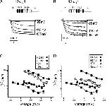 Figure 5. Effect on opening kinetics of replacing the S1–S3 or S4–S6 transmembrane subdomains of HCN1 with corresponding regions of HCN2. (A) Currents elicited by hyperpolarizing steps for chimera in which the S1–S3 region of HCN1 was replaced with the corresponding region of HCN2 (chimera 12S1-31). (B) Currents elicited by hyperpolarizing steps for chimera in which the S4–S6 region of HCN1 was replaced with the corresponding region of HCN2 (chimera 12S4-61). (C) Relation between the rate of opening (1/τ) and test potential for the chimera 12S1-31 (inverted open triangles; n = 5). 1/τ values of HCN1 (filled circles), HCN2 (filled squares), and 121 (filled triangles) from Fig. 3 are also plotted for comparison. (D) Relation between the rate of opening (1/τ) and test potential for the chimera 12S4-61 (inverted open triangles; n = 13) and other constructs described above.