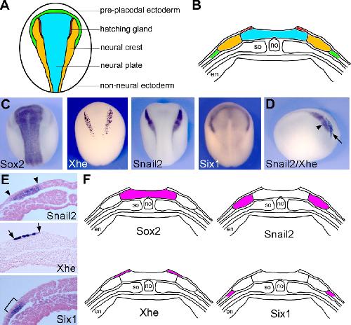 Molecular characterization of neural plate and NPB cells. (A) Dorsal view (anterior to top) of a schematic representation of an early neurula stage Xenopus embryo highlights the position of the neural plate, nonneural ectoderm, and intervening NPB cells that include the prospective HG, NC, and PE. (B) Schematic representation of a transverse section through a neurula stage embryo in which the different components of the ectoderm are color coded according to A. en, endoderm; so, somite; no, notochord. (C) Expression of neural plate- (Sox2) and NPB (Snail2, Xhe, and Six1)-specific genes by whole-mount in situ hybridization. Dorsal views, anterior to top. (D) Double in situ hybridization showing the relationship of Snail2 (NC; arrowhead) and Xhe (HG; arrow) expression domains. Lateral view, anterior to right. (E) Transverse section through neurula stage embryos illustrating the relative position of the presumptive HG (Xhe; arrows), NC (Snail2; arrowheads), and PE (Six1; bracket). (F) Schematic representation of cross-sections through neurula stage embryo showing the domain of expression of the Sox2, Xhe, Snail2, and Six1 (purple). |