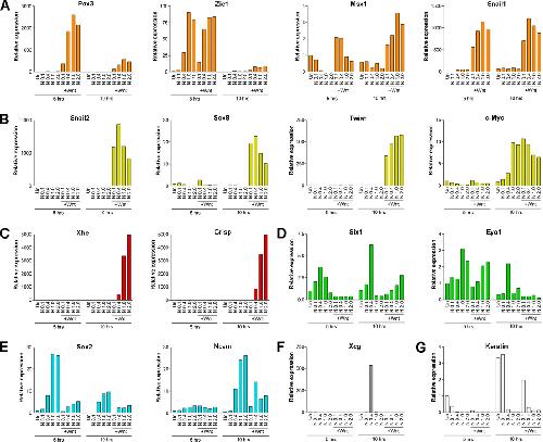 Regulation of NPB cell fates by Bmp attenuation and Wnt signaling. Embryos at the two-cell stage were injected in the animal pole with increasing doses of Noggin (N) mRNA (0.1, 0.4, 1.0, and 2.0 ng) alone or in combination with Wnt1 (+Wnt) mRNA (100 pg). Animal explants were dissected at the blastula stage, cultured for 5 or 10 h, and analyzed by real-time RT-PCR for the expression of four putative NPB specifiers, Pax3, Zic1, Msx1, and Snail1 (A), and a number of cell type-specific genes: Snail2, Sox8, Twist, and cMyc for NC (B); Xhe and Crisp for HG (C); Six1 and Eya1 for PE (D); Sox2 and Ncam for neural plate (E); Xcg for cement gland (F); and Keratin for epidermis (G). Un, uninjected animal explant. Each value was normalized to the level of EF1α expression. |